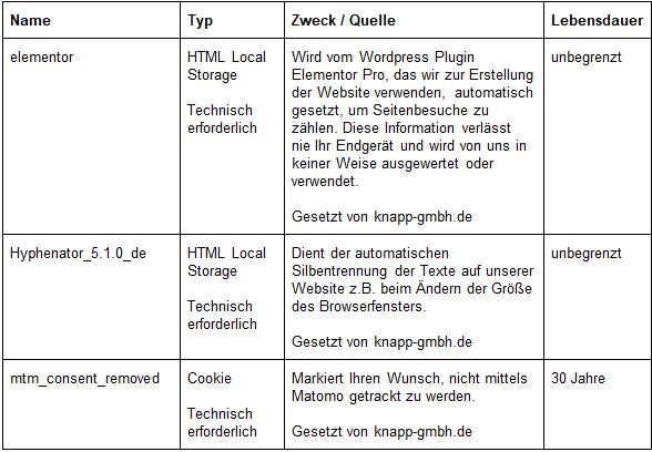 Im technisch erforderlichen Umfang setzen auch wir einige wenige Elemente auf Ihrem Endgerät. Dies berührt zwar nicht Ihren Datenschutz und ist auch nicht einwilligungspflichtig, trotzdem sind wir aber verpflichtet, Sie darüber aufzuklären, was wir in der nachfolgenden Tabelle gerne tun: